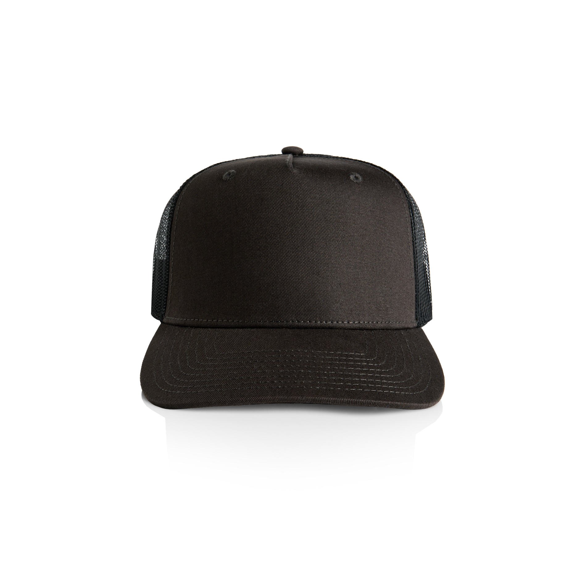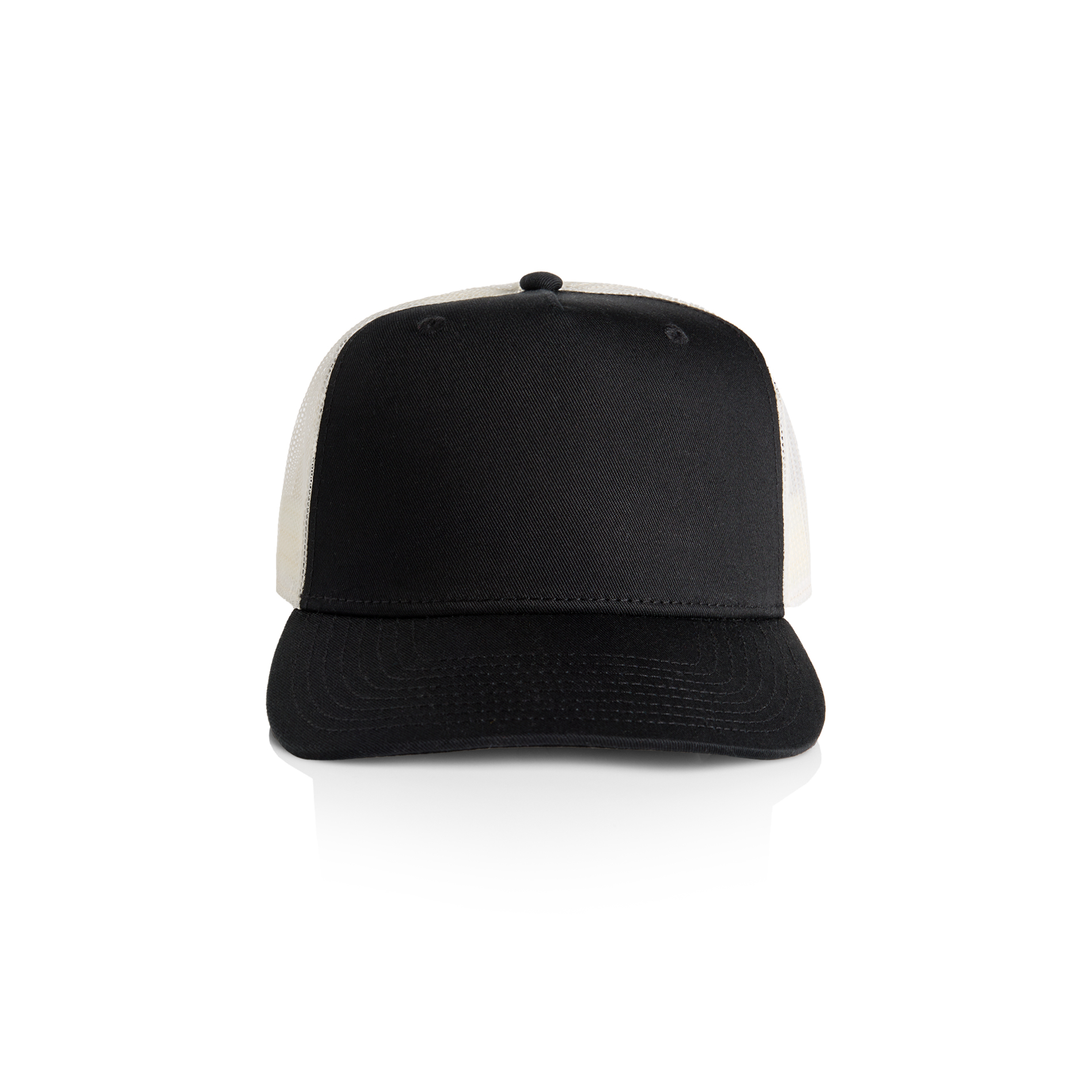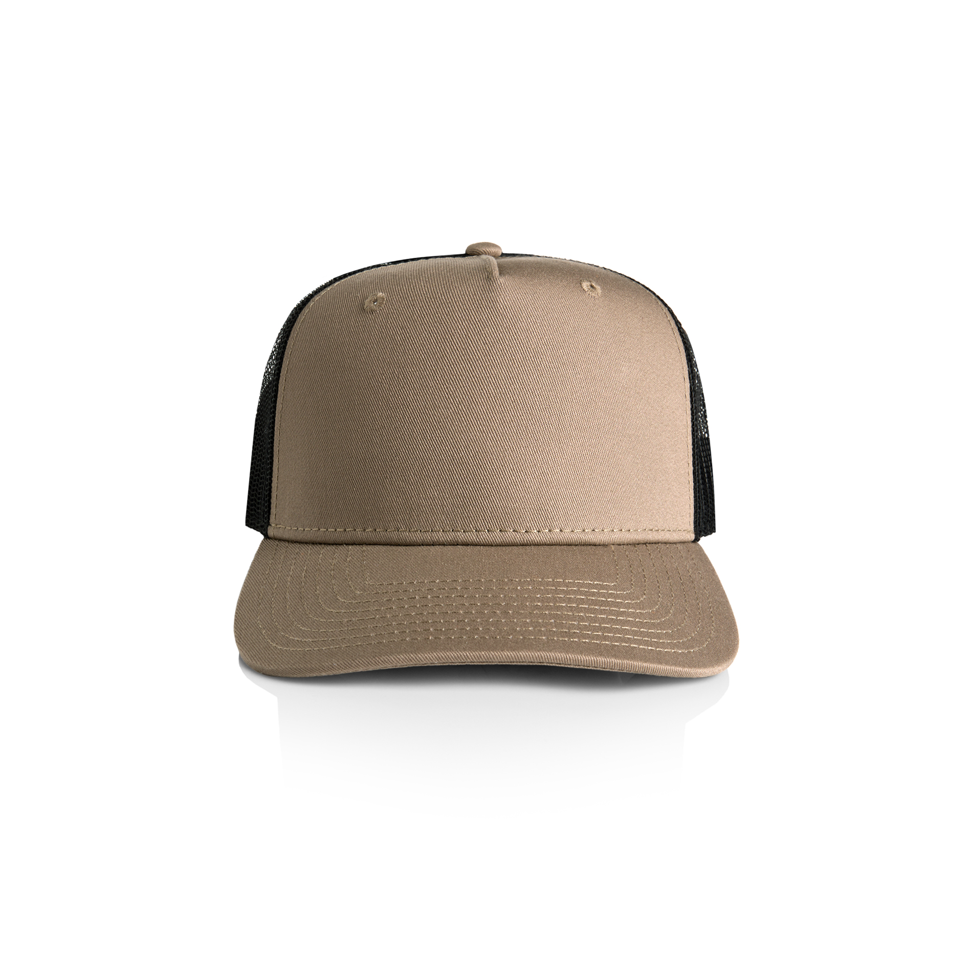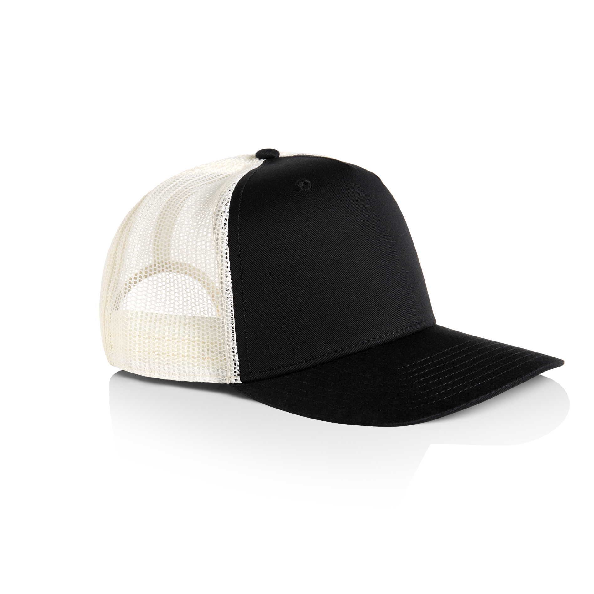 100% cotton front and peak, 100% polyester mesh back
