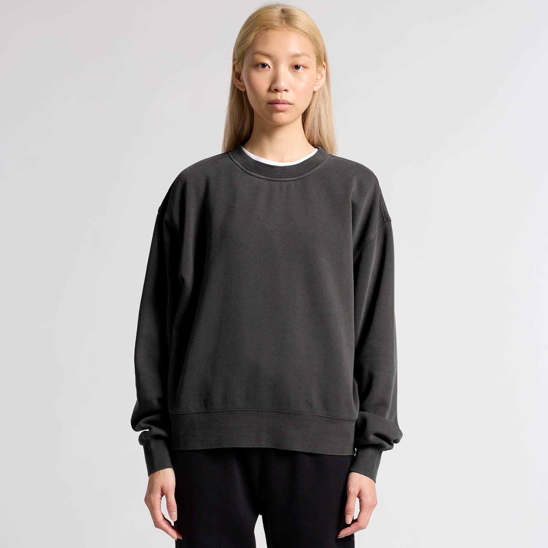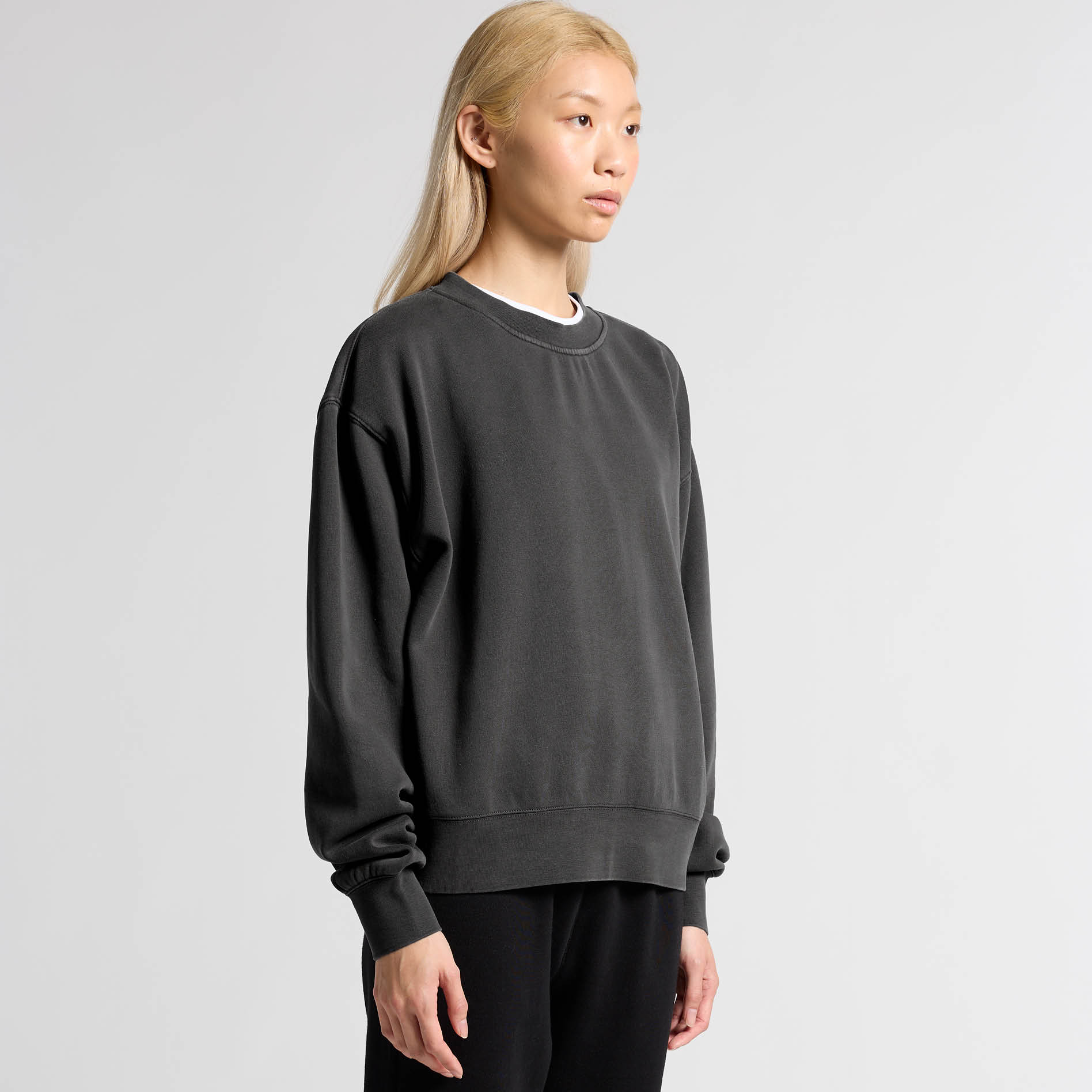 Wide neck ribbing with twin stitching, cropped full length, side seamed, shoulder to shoulder tape, double needle hems, garment dyed, preshrunk to minimise shrinkage