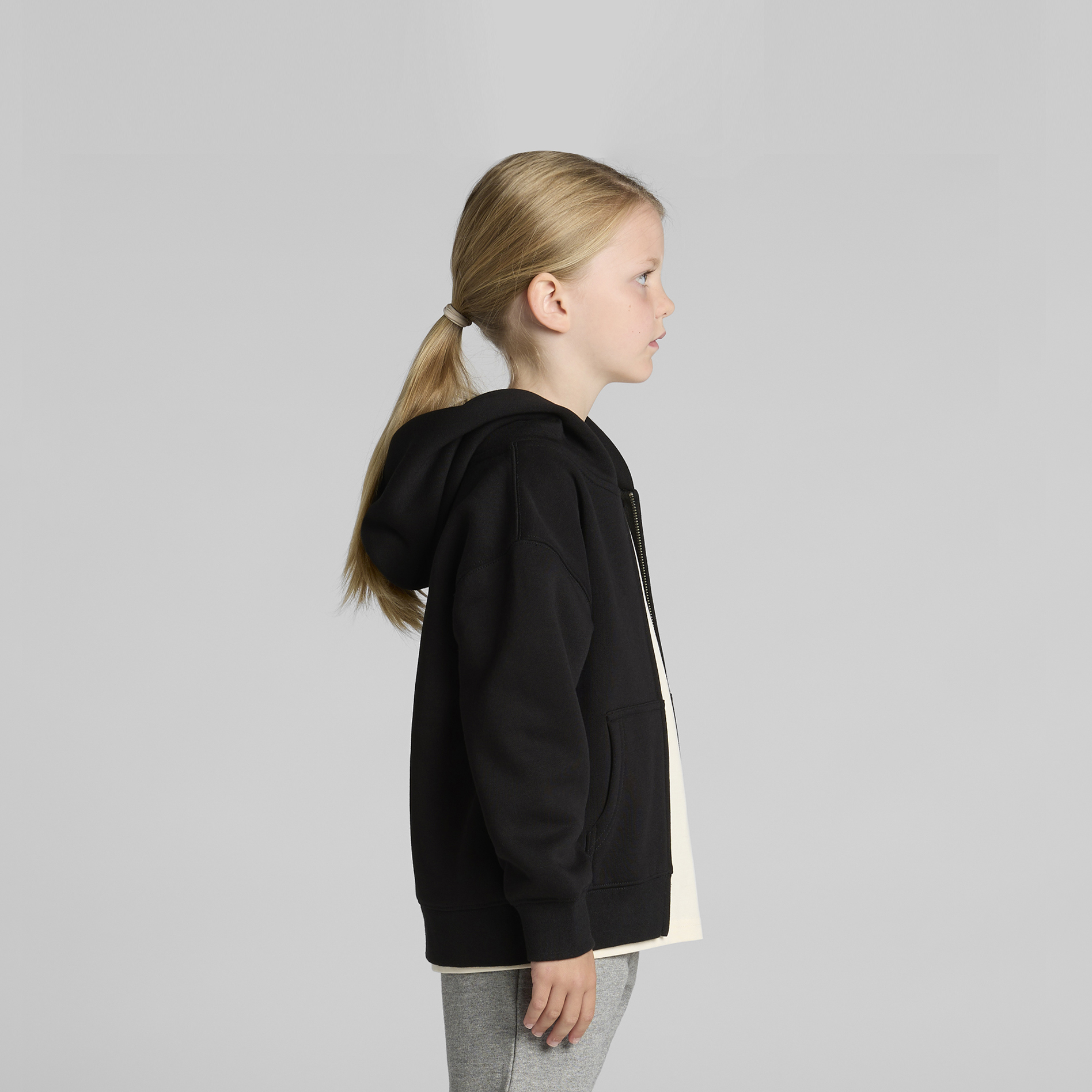 Zip hood, drop shoulder, kangaroo pocket, self-fabric lined hood, no drawcord, YKK zip, sleeve cuff ribbing