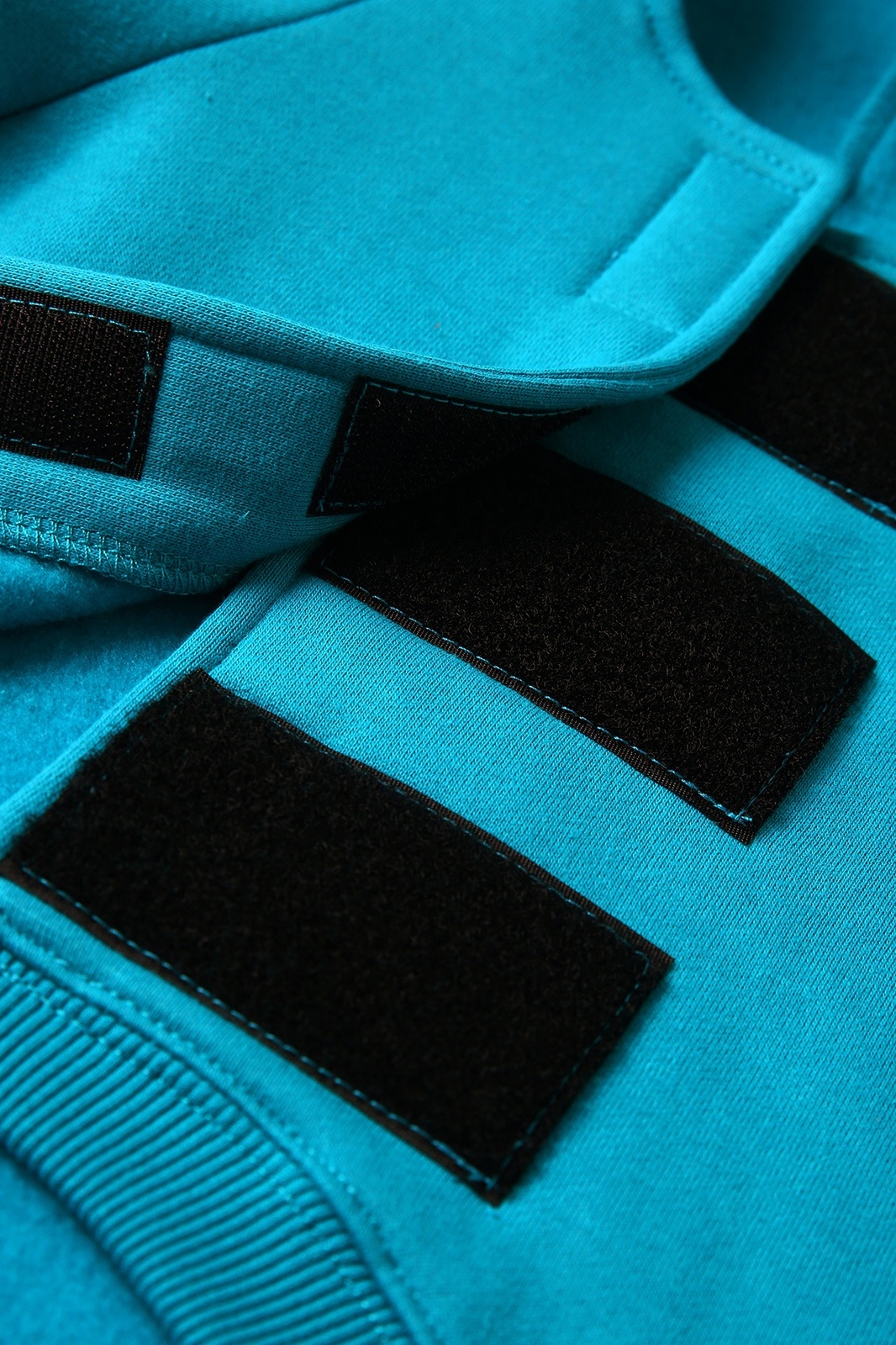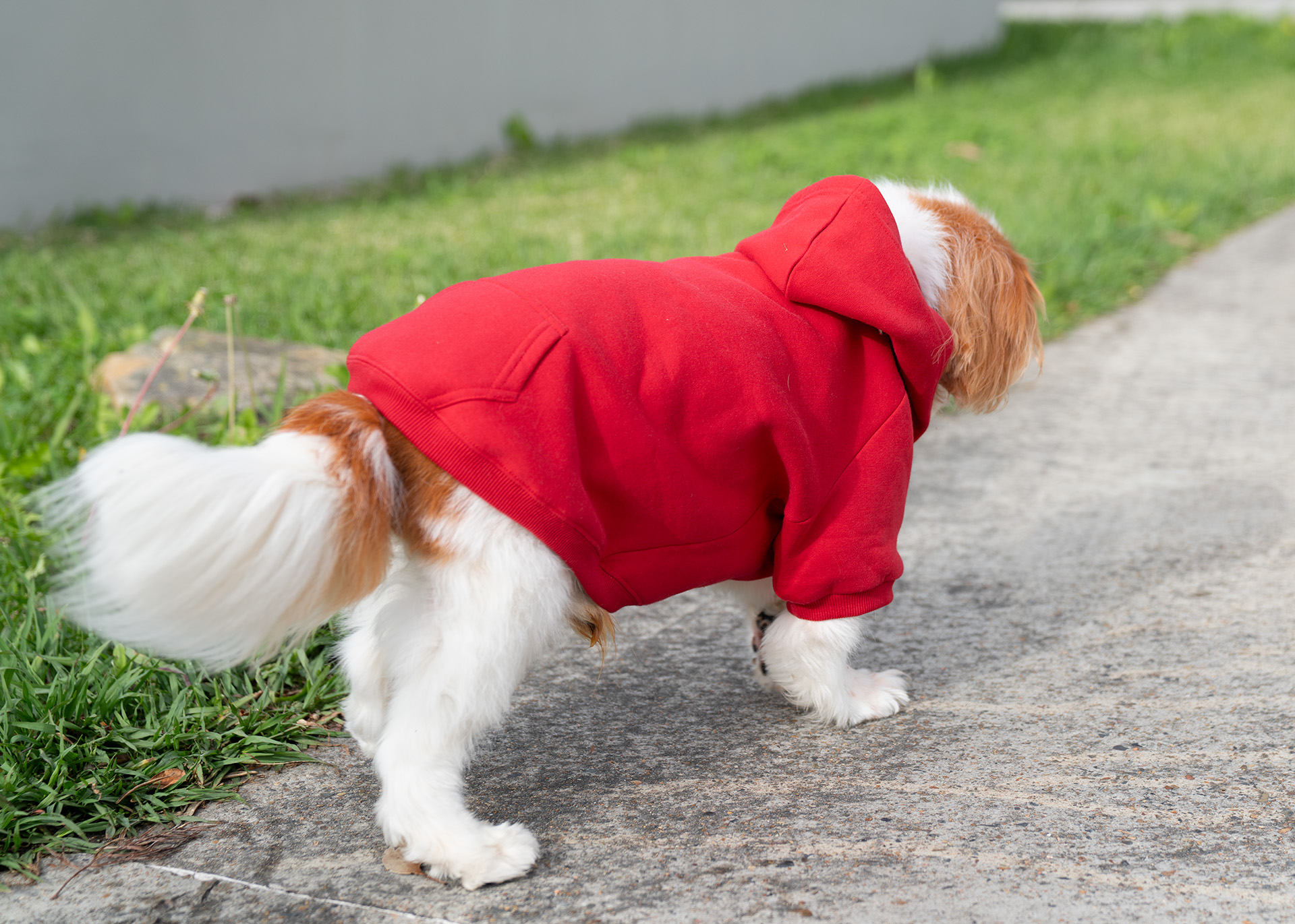 The back of the hoodie features an opening secured with Velcro, allowing it to wrap around and fasten under the dog's belly with adjustable support